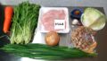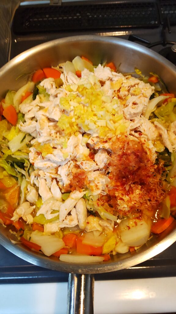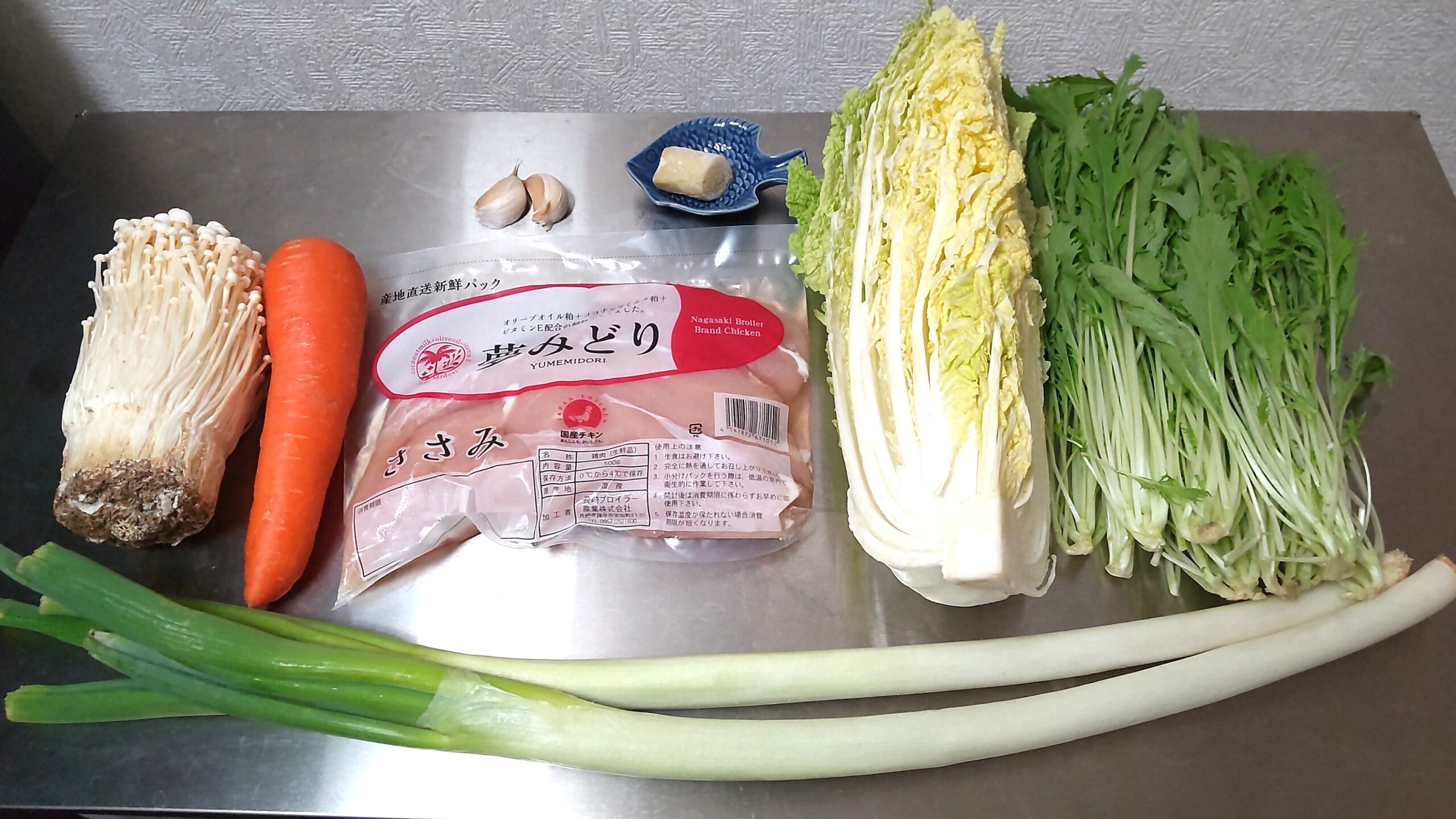 鶏のササミ:500g、白菜:1/4玉、水菜:1袋、にんじん:1本、白ねぎ:2本、エノキ:1株、ショウガ:1片、ニンニク:2片