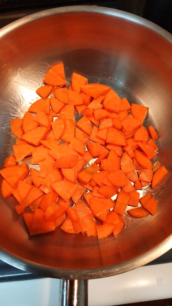 2.にんじんを銀杏切り、米油をひいたフライパンに入れ、弱火で炒める。