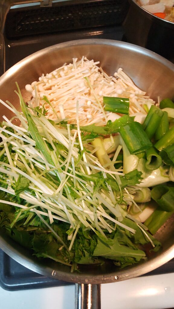 3.にんじんに火が通ってきたら、水菜とエノキをざく切り、白ねぎの白い部分は斜め切り、緑の部分はざく切りにして2に加える。