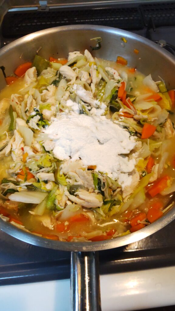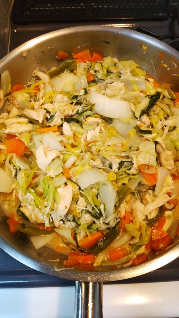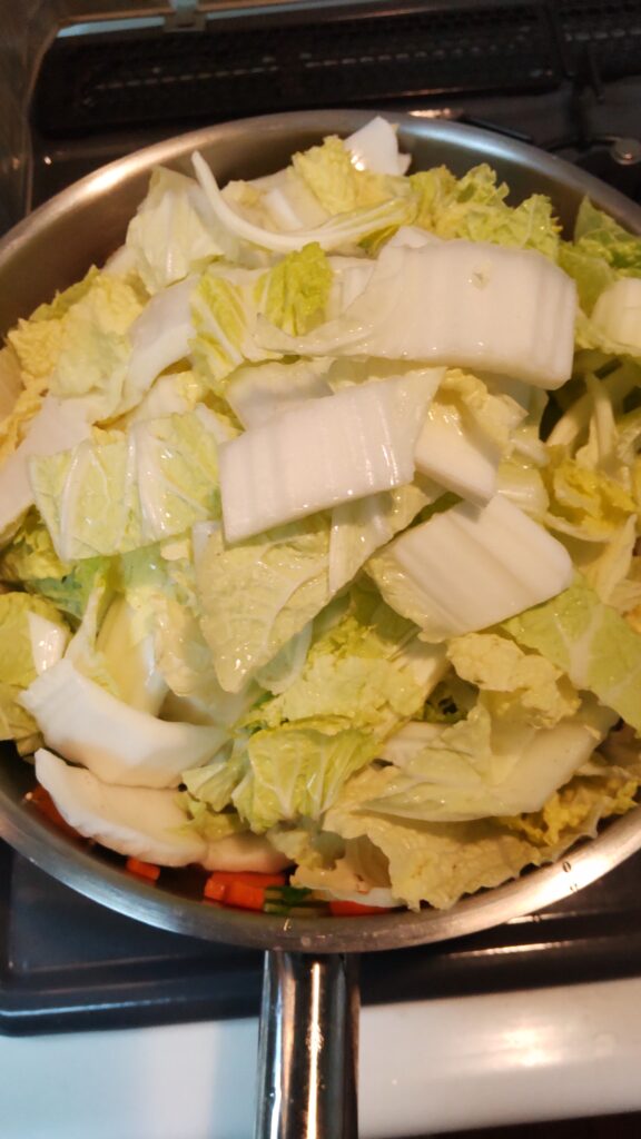 4.3で加えた野菜に軽く火が通ってきたら、白菜をざく切りにして加えて、全体に火が通るまで弱火で炒める。