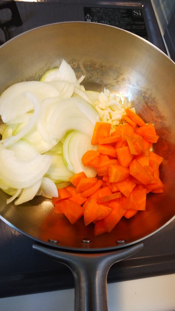 2.にんじんを銀杏切り、玉ねぎを薄切り、ニンニクをみじん切り、オリーブオイルをひいたフライパンに入れ、弱火で炒める。