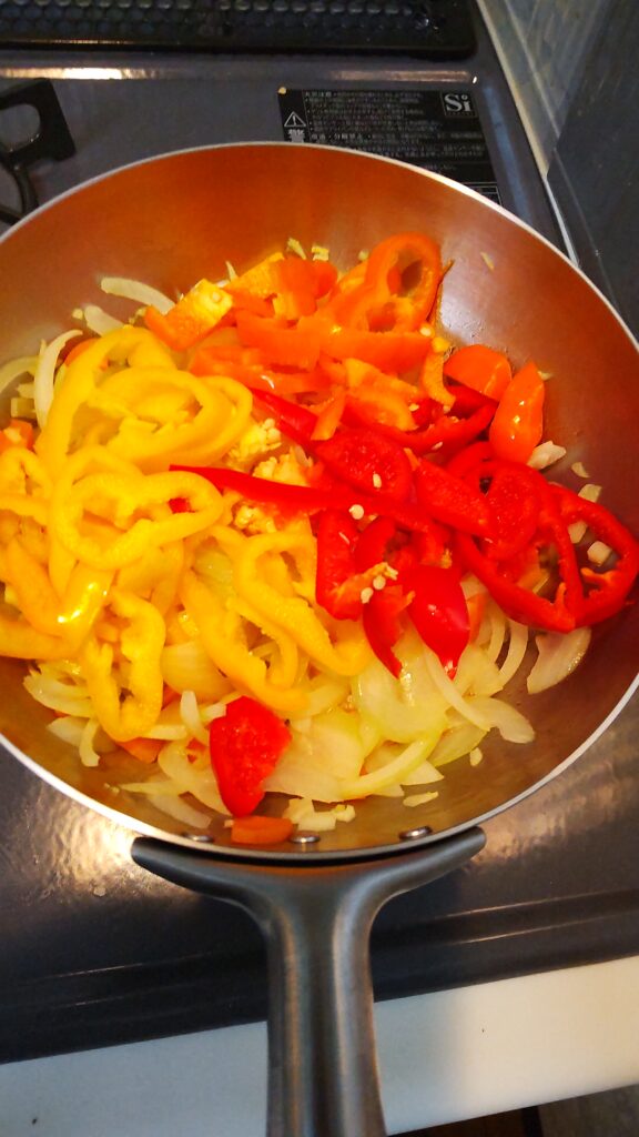 3.玉ねぎがしんなりしてきたら、カラーピーマンを輪切り2に加える。