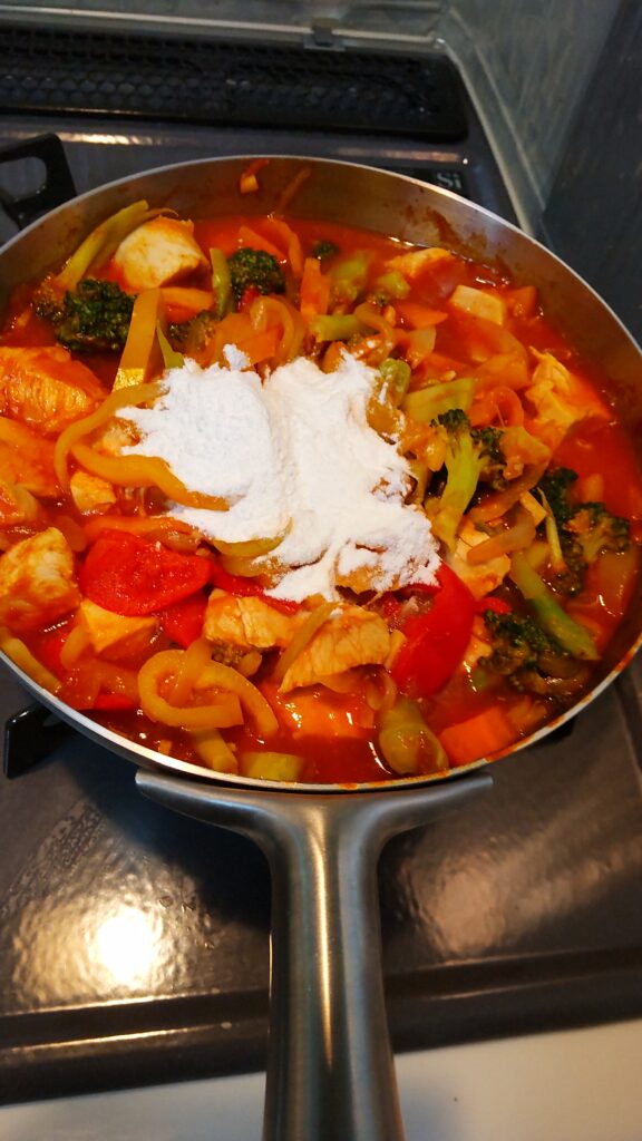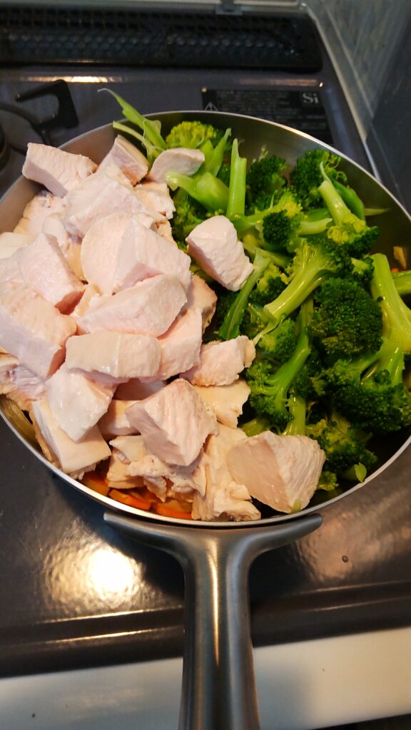 4.3で加えた野菜に軽く火が通ってきたら、鶏むねの皮を取り除いた後、ブロック状に切り、ブロッコリーは小さめに切って、3に加える。Aとナポリタン缶も共に3に加え、味がなじむように温めながら全体を混ぜる。