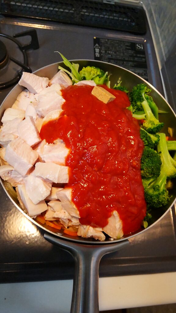 4.3で加えた野菜に軽く火が通ってきたら、鶏むねの皮を取り除いた後、小さめのブロック状に切り、ブロッコリーは小さめに切って、3に加える。Aとナポリタン缶も共に3に加え、味がなじむように温めながら全体を混ぜる。