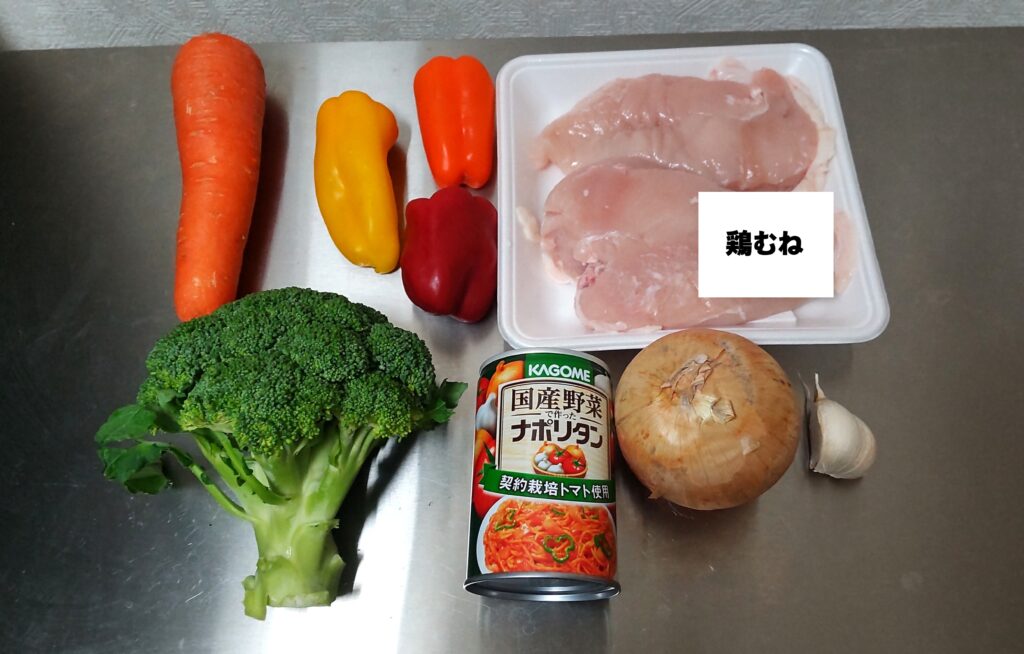 鶏むね(鶏の胸肉・皮除く):500g、ブロッコリー:1房、カラーピーマン:1袋、にんじん:1本、玉ねぎ:1玉、ニンニク:2片、ナポリタン缶:1缶